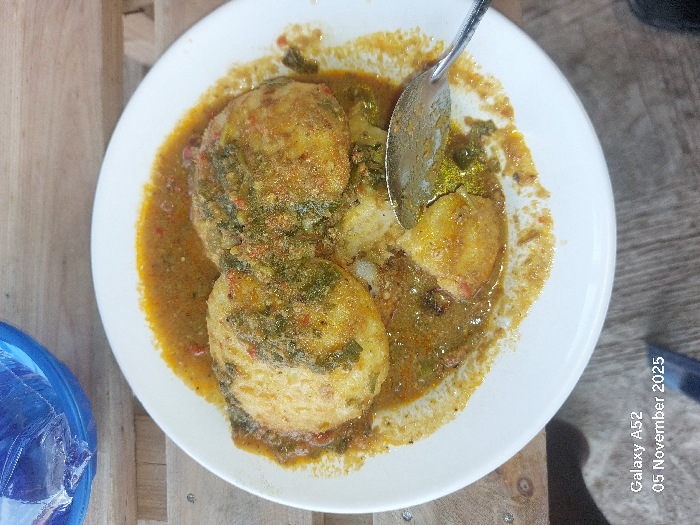 The image displays a meal on a white, round plate, positioned on a light brown wooden surface composed of horizontal planks. The plate contains three irregular, rounded food items, likely tubers such as yam or potato, partially submerged in a thick, reddish-orange-brown sauce with visible red and green particulates. A distinct green, finely textured topping or condiment is distributed across the top surfaces of the food items and portions of the sauce. A silver-colored spoon is present on the right side of the plate, its bowl resting in the sauce next to a section of one food item that appears partially consumed or scooped out, revealing its lighter interior. In the upper left background, a segment of a blue object, possibly a plastic bowl covered with clear plastic film, is visible on the wooden surface. A digital watermark in the bottom left corner indicates "Galaxy A52" and "05 November 2025." No specific location within Akwanga, Nigeria, is discernible from the visual content.