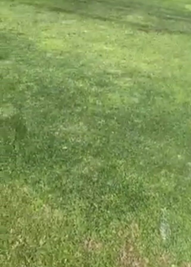 person walking on a grassy field towards a stadium under a blue sky. The grass is green but has some brown patches. There's a white line painted on the field. A person in a maroon shirt walks in the distance. The stadium has rows of seats, a covered section, and a tall light pole. Later, a group of people also wearing maroon shirts appear on the field in the distance.