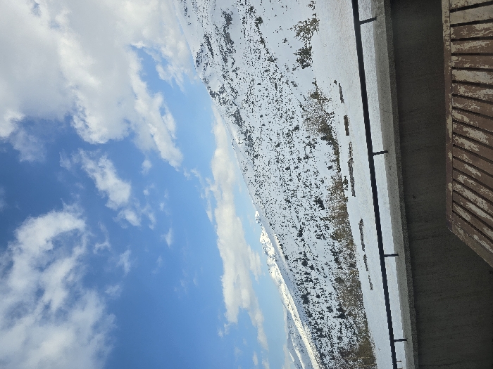 The image displays a snow-covered mountain landscape in Panichishte, Bulgaria, observed from an outdoor balcony or terrace during daylight. The upper portion of the frame features a bright blue sky with scattered white cumulus clouds, denser on the right. The middle and background are dominated by steep mountain slopes covered in a substantial layer of snow. Patches of dark evergreen trees are visible across the lower and middle elevations of the mountains, interspersed with some exposed rock or bare deciduous trees. Distant mountain peaks are also snow-capped. In the foreground, a dark grey concrete or stone balcony wall with a black metal railing runs horizontally across the lower third of the image. Below the railing, a weathered wooden table or bench is partially visible, showing horizontal slats with peeling brown paint exposing lighter wood underneath. No individuals or animate subjects are present in the scene.