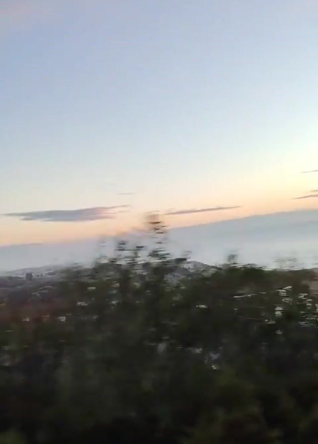 The video, shot from a moving vehicle, captures a scenic view of a town nestled near the coastline under a pastel-colored sky