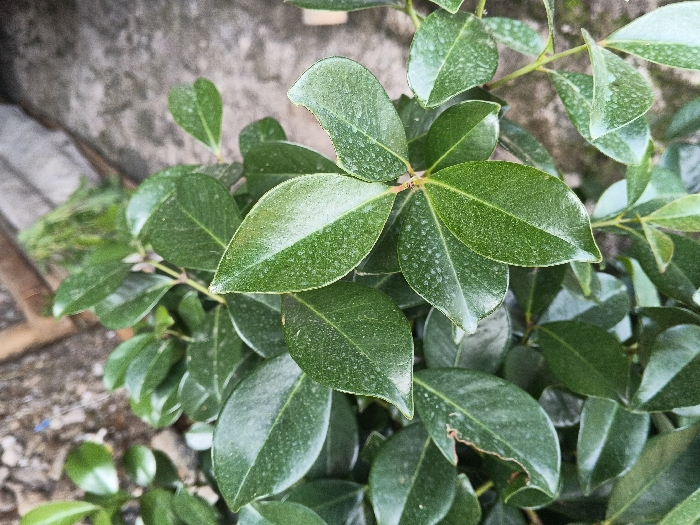 A close-up shot focuses on a vibrant green plant with glossy leaves. The leaves, dense and clustered, exhibit slight imperfections or variations in texture. The background is blurred, suggesting a shallow depth of field. An aged concrete surface and sparse grass are subtly visible in the periphery. The lighting is even, highlighting the natural color and form of the plant.