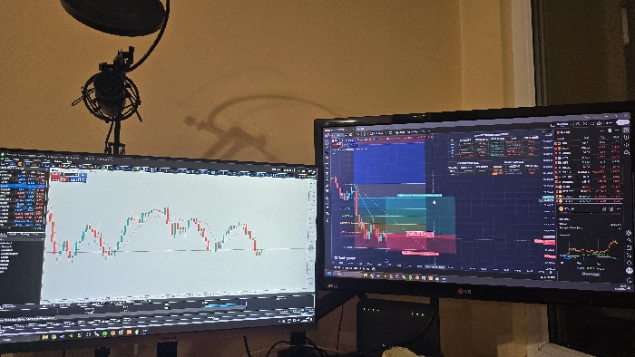 The scene depicts an indoor environment, presumed to be in Burgas, Bulgaria, although no specific geographical identifiers are discernible from the visual evidence. Two active computer monitors are centrally positioned. The left monitor displays a financial charting interface featuring a light background with green and red candlestick patterns and a data table on the left margin. The right monitor, identified by an "LG" logo on its bottom bezel, presents a dark-themed financial chart with multiple colored rectangular overlays (blue, green, red) and similar candlestick patterns, accompanied by various data panels and icons. Above the left monitor, a black condenser microphone is mounted within a shock mount and fitted with a circular black pop filter; its shadow is cast upon the light-colored wall. A dark, rectangular electronic device is situated below and between the monitors. The overall lighting is artificial and ambiently dim. No individuals are present within the frame.