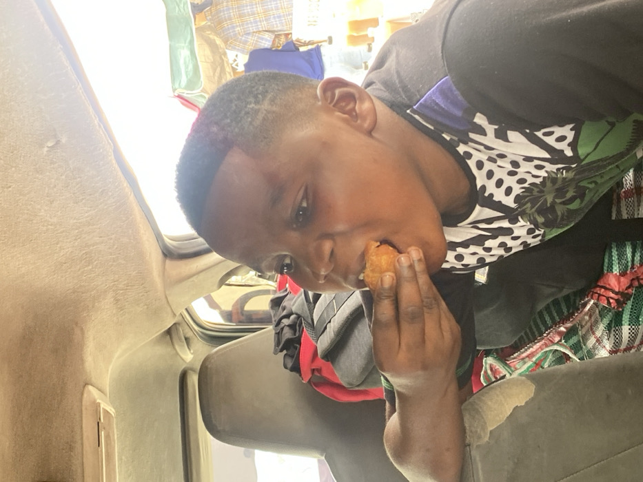 A young male, estimated to be between 8 and 12 years old, with dark skin and a short, faded haircut, is depicted seated inside a vehicle