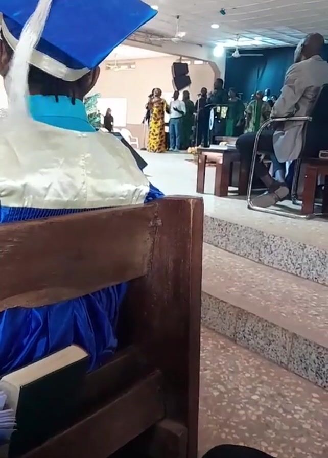 From the perspective of someone in a church pew, the video shows a choir singing on stage, including at least one woman in a long yellow patterned dress with a microphone. Seated at the end of the pew is a person wearing a blue graduation gown and mortarboard cap with a white tassel. The choir stands on a stage with several small steps leading up to it. The interior of the church is visible, including overhead lighting and ceiling fans. A seated person is visible on the right side of the frame. The church appears to be full of people.