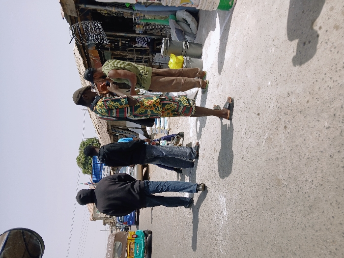 An outdoor street scene is depicted in the city of Kungulu School, Zambia, under a bright, clear sky. The paved road surface features scattered white debris and strong, distinct shadows. On the left side of the street, an aqua-colored auto-rickshaw faces away from the camera, followed by a blue sedan and a silver sedan, both also facing away. A blue flatbed truck is visible in the distant background. Two males walk away from the camera on the left; one wears a black hooded sweatshirt and blue jeans, while the other, positioned slightly behind him, wears a black sweatshirt and blue jeans. In the mid-ground, two males stand facing each other, engaged in an interaction. The man on the left wears a multi-colored patterned short-sleeved shirt, matching shorts, a dark cap, and dark sandals. The man on the right wears a green sleeveless top, brown trousers, and a dark baseball cap; he holds an unidentified object in his hands, seemingly presenting it to the other man. The right side of the street is lined with multiple structures, likely shops or stalls, featuring corrugated metal roofs. Merchandise is displayed outside, including rolls of coiled material (possibly wire or cable) hanging, and stacks of white and grey buckets, yellow sacks, and other hardware items on the ground. A person in a striped shirt is partially visible, seated within one of these structures. Overhead power or communication lines are visible in the upper mid-ground. A vehicle's side mirror is partially visible in the upper-left corner of the frame.