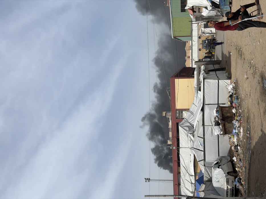 This image depicts a street scene in the city of Gaza, Palestinian Territory, under a lightly clouded, pale blue sky. In the midground, plumes of dense black and dark grey smoke rise from behind and above a reddish-brown and yellow building, extending horizontally across the frame. The foreground is a dirt path littered with trash, including plastic bags, wrappers, and debris. To the left, a white car, possibly a Peugeot with a partial license plate "4832-05," is covered by a light-colored tarp. Adjacent to it, a rusty brown metal dumpster overflows with refuse. Several makeshift shelters, constructed from white tarps and black framing, are visible on both sides of the path, some appearing disheveled. On the right side of the foreground, two men are present. One man stands facing slightly towards the camera, wearing a red short-sleeved shirt and dark pants, supporting himself with a single black crutch under his left arm. To his left, another man sits on a low blue object, dressed in a dark t-shirt and dark pants, looking down at a mobile phone. Further down the dirt path, a person in dark clothing walks away from the viewer, and a dark utility vehicle, possibly a pick-up truck, is parked. Beyond the shelters, an industrial-style building with a reddish-brown upper section and yellow lower facade is prominent on the left, adjacent to a similar structure with a green-striped facade on the right. A tall metal pole with floodlights is visible on the far left, behind the shelters and buildings.