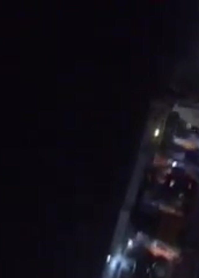 The video appears to be taken at night, from a low angle looking upwards. At the beginning, it's mostly dark, but gradually, shapes become discernible. There's a vertical structure with lights on it. Near the bottom, indistinct figures move around. At one point, a light-colored jacket or piece of cloth moves into the frame and momentarily blocks the view. The video continues to show the vertical structure and the dark surroundings. It is difficult to make out precise details due to the poor lighting and low image quality.