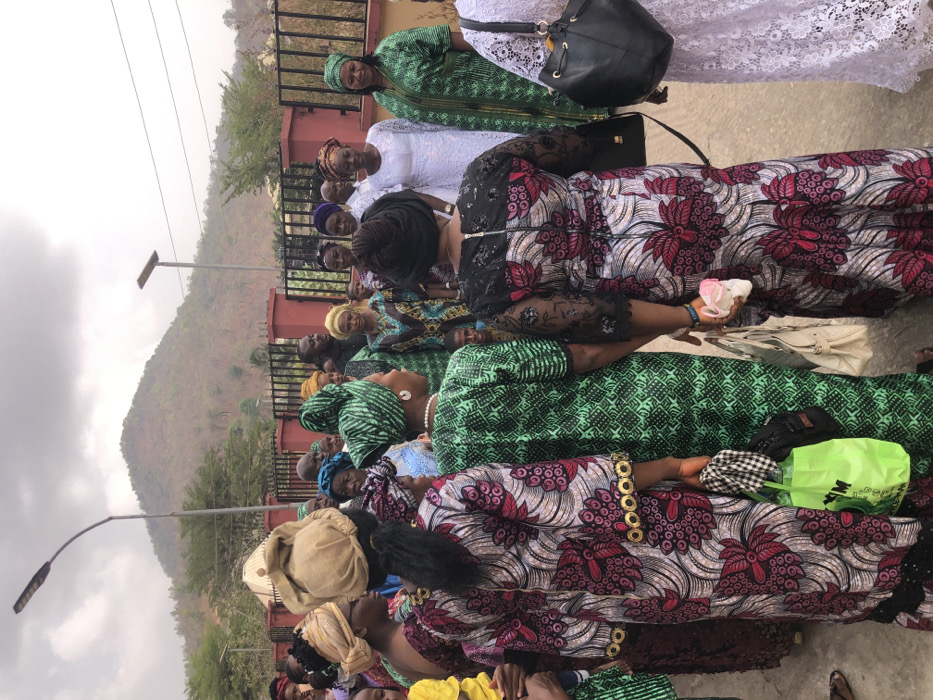 An outdoor scene in Lokoja, Nigeria, depicts a dense gathering of approximately 20-30 individuals, primarily adult females, standing on a paved surface