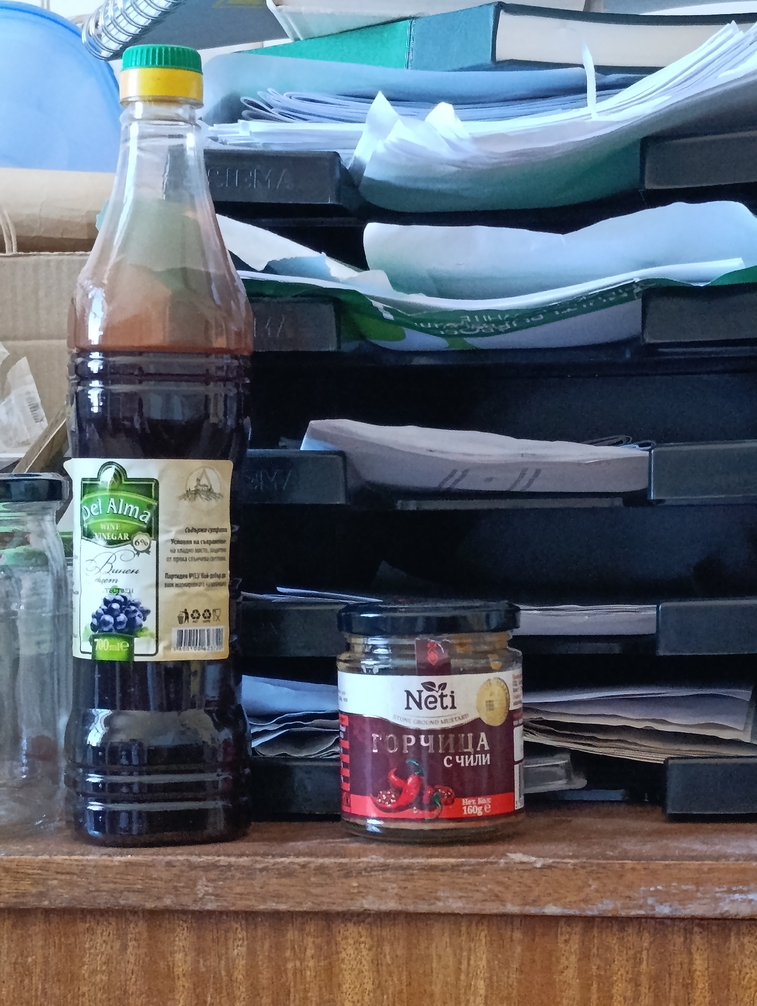 The image captures a still life of food items situated on a wooden surface, likely a shelf or countertop. A tall, clear plastic bottle labeled "Del Alma Wine Vinegar" (6%) with a green and yellow cap stands prominently on the left, its label adorned with a depiction of grapes. Next to it, partially obscured, is a glass jar. To the right, a smaller jar labeled "Neti Stone Ground Mustard with Chili" is visible. The background consists of a cluttered office setting, with black plastic document trays filled with paper and office supplies. The lighting is indoor and moderate. The objects suggest a setting where food preparation and office work intersect. The location is Sofia, Bulgaria based on text written on the product labels.