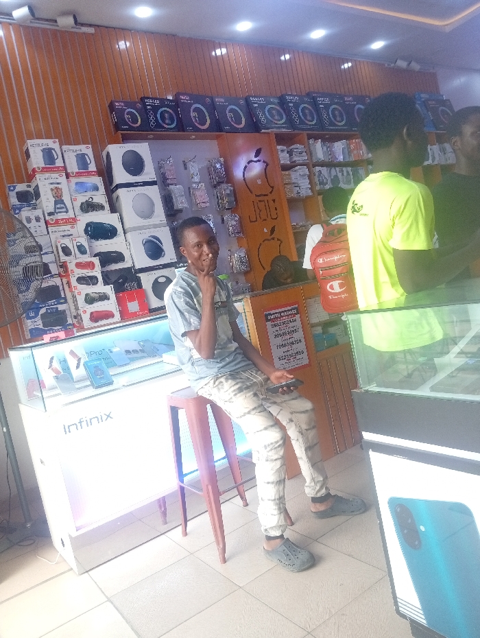 The scene depicts the interior of an electronics and gadget retail store in Lokoja, Nigeria