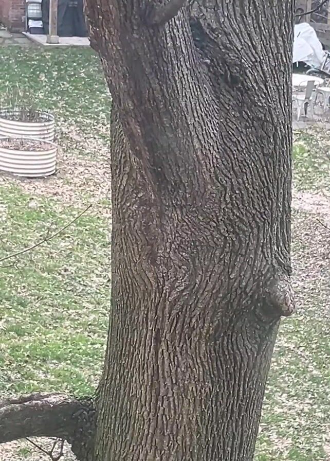 The camera pans up the trunk of a mature tree