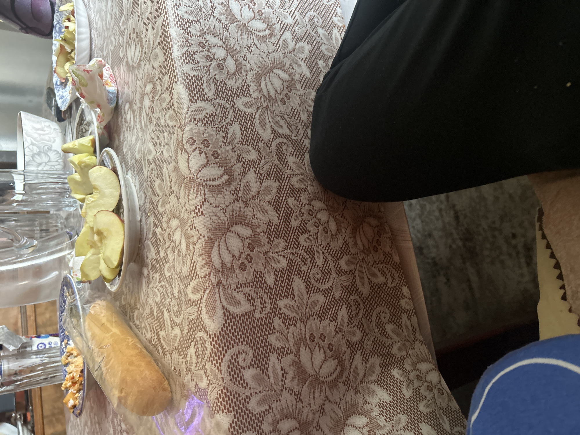 The image depicts a table covered with a lace tablecloth. On the table are a plate of sliced apples, a loaf of bread in a plastic bag, and a dish with salad. A person wearing black pants is sitting at the table. The location is potentially a dining area within Karnobat, Bulgaria, suggested by the food on the table.