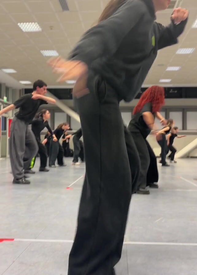 In a brightly lit, high-ceilinged indoor space, a group of about a dozen individuals are engaged in a dance or movement practice. They are dressed in casual clothing, with many wearing black outfits. The camera's perspective is from a low angle, placing the viewer within the group of dancers. The dancers are spread out across a gray tiled floor marked with white lines, creating a grid-like pattern. They are performing similar movements, involving arm extensions, leg lifts, and energetic stepping. The focus of the shot shifts as the camera moves slightly, showing different dancers in the foreground. The background features large windows and white walls, with air conditioning vents visible on the ceiling. The room appears to be a dance studio or multipurpose hall.