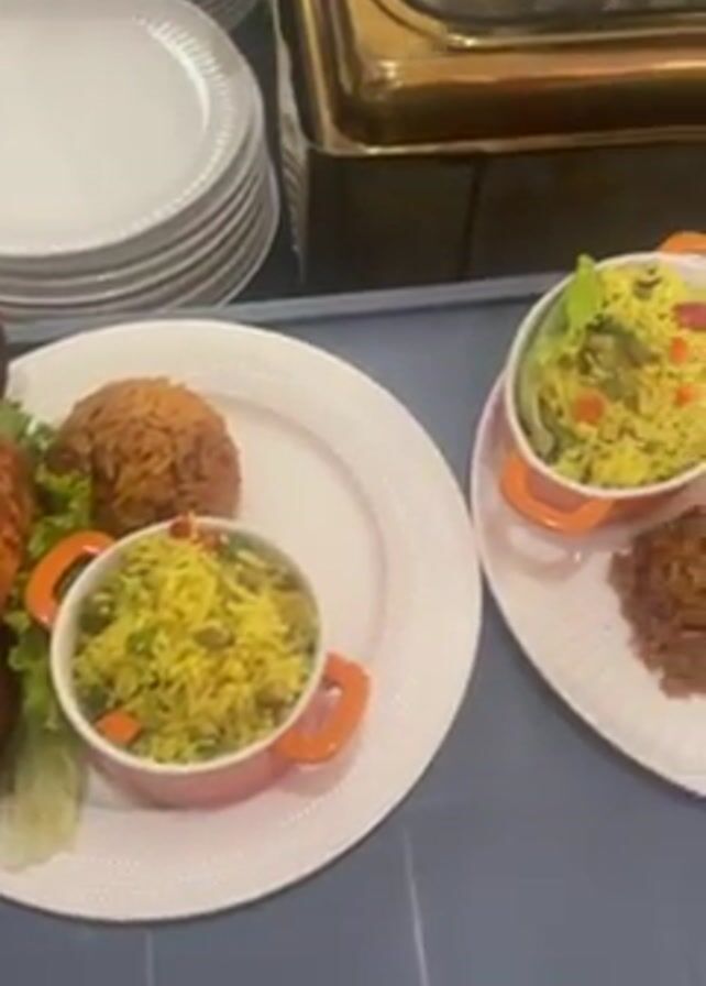 buffet spread. There are stacks of white plates and gold-colored food warmers. Plates are arranged with a scoop of brown rice, yellow rice in small orange bowls, fried food, and lettuce. One plate includes a small white bowl of liquid and a fish. A black water bottle is also visible.