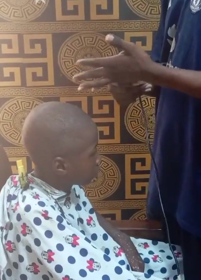 In a medium shot, a barber shaves a child's head with an electric razor
