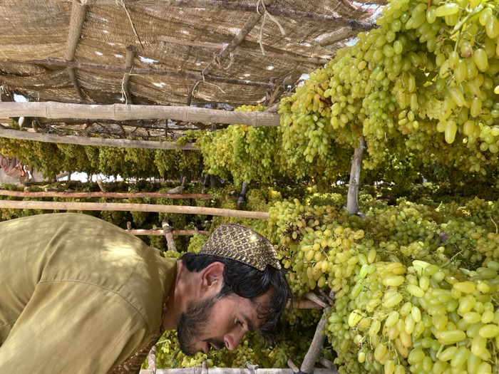 A male individual is depicted in an outdoor or semi-open structure in Bazar-e Panjva'i, Afghanistan, dedicated to drying grapes