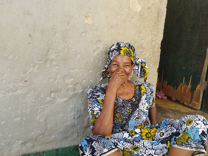 An older woman, wearing a black, blue, and yellow floral dress and matching headscarf, sits on the floor in front of a plain, gray, weathered wall. The woman is smiling with her hand on her face and looking towards the right side of the image. Her right leg is bent and she appears to be wearing sandals. The woman sits on a green and blue mat in front of a partially opened, wooden, green door. The scene appears to be in front of a home in Bajoga, Nigeria, at the provided coordinates.