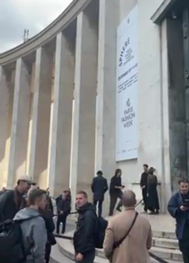 crowd of people standing in front of a large building with tall columns. A banner on the building advertises Paris Fashion Week and a Sphere Paris Fashion Showroom event. Some people are talking, while others are walking up the steps into the building. The weather appears to be overcast. The architecture of the building suggests a classic, possibly art deco style.