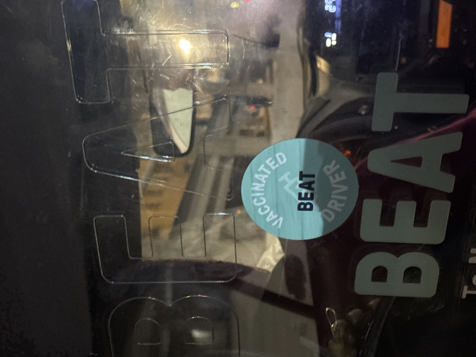 "BEAT" sign, presumably for a transportation service. Overlapping the sign is a circular sticker stating "VACCINATED DRIVER" with "BEAT" in a slightly bolder font in the middle of the sticker. The text and sticker appear to be on a vehicle's dashboard or window. The surrounding area is dimly lit and hints at a car interior.