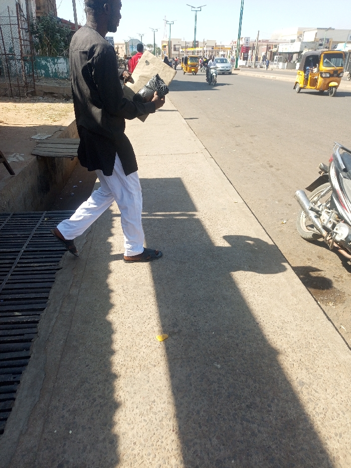 This image depicts a sunlit street scene in Pantame, Nigeria. In the foreground, an adult male with dark skin walks from left to right on a concrete sidewalk, facing partially away from the camera. He wears a dark, long-sleeved tunic over white trousers and dark sandals. He holds a rectangular brown cardboard package and a crumpled black object in his hands. To his left, a metal grate covers a drainage ditch. Distinct, long shadows from individuals and objects, including the primary subject, are cast across the sidewalk, indicating strong overhead sunlight. A small, yellow, irregularly shaped object rests on the concrete. On the far right, the rear wheel and exhaust pipe of a silver and black motorcycle are partially visible. Beyond the sidewalk, a paved road stretches into the background. Traffic includes multiple yellow auto-rickshaws ("Keke Napep"), a white sedan, and several motorcycles with riders. Low-rise commercial or residential buildings line both sides of the street in the distance. Streetlights with multiple horizontal fixtures are visible along the road. The sky is clear and bright blue.