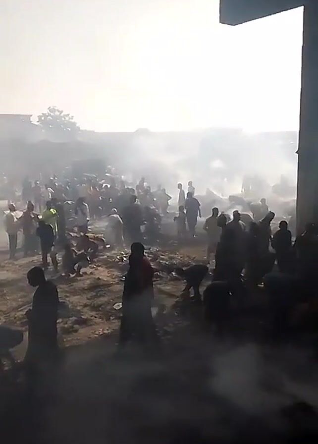 large group of people gathered in an open area under what appears to be a bridge or elevated structure. A significant amount of smoke fills the air, reducing visibility. Many individuals are seen sifting through debris on the ground, suggesting they are searching for something. The scene appears chaotic and potentially after the event of an incident, possibly a fire. The environment is outdoors and seems to be an urban or semi-urban setting.