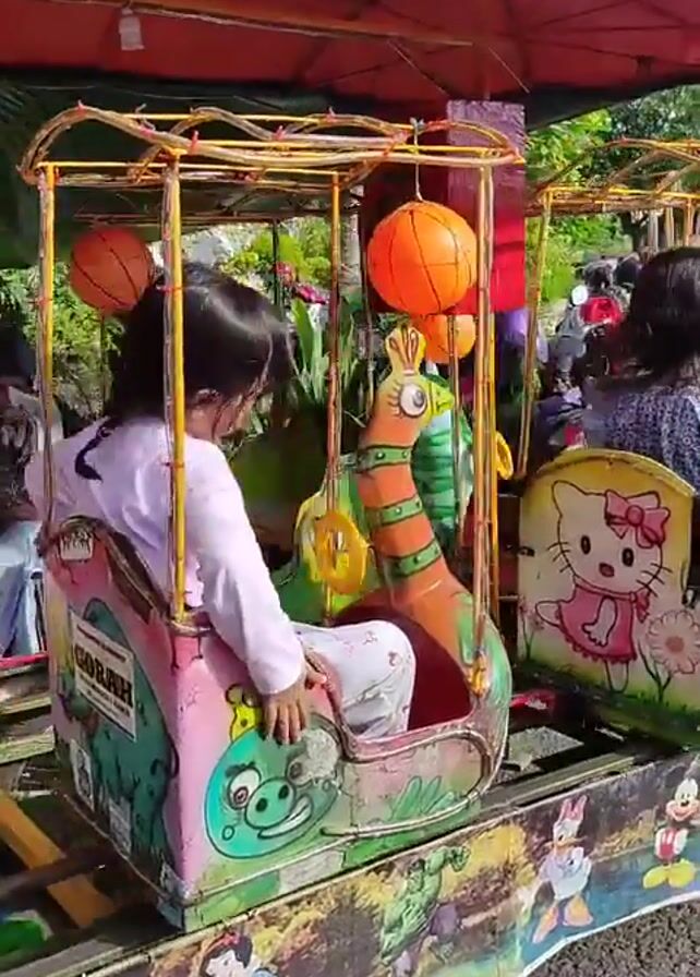 children's amusement ride, likely a small roundabout-style attraction, in operation. **People:** There are at least two young girls riding on the attraction. One girl is wearing a light-colored long-sleeved shirt and patterned pants. The other girl has her back to the camera. **Objects:** * The ride itself consists of several brightly painted, enclosed cars or seats. * One car is decorated with Hello Kitty. Another has a pig cartoon character. * There's a stylized peacock figure between the cars. * Orange balls are suspended above as decoration. * The base of the ride is painted with cartoon characters like Iron Man, Snow White, and Mickey Mouse. **Actions:** The ride is rotating, moving the children around in a circle. The girls are sitting in their respective cars, observing the surroundings. **Interactions:** The girls seem to be enjoying the ride, though there is no direct interaction observed between them. **Environment:** The location appears to be an outdoor area. Other parked vehicles, including motorcycles, are visible in the background. It seems to be a public space. The overall impression is a simple children's amusement being enjoyed in a casual, public setting.