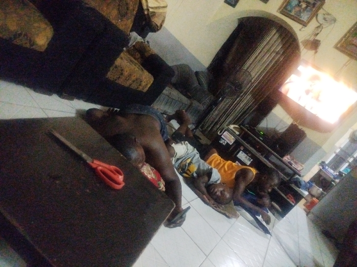 Three people are lying on the floor, seemingly asleep, in a room with a TV, fan, couch, and table. One person is shirtless, lying next to a pair of red scissors on the table. The other two are wearing shirts, and one of them has a yellow shirt. The room is messy with items scattered around. Pictures hang on the wall.