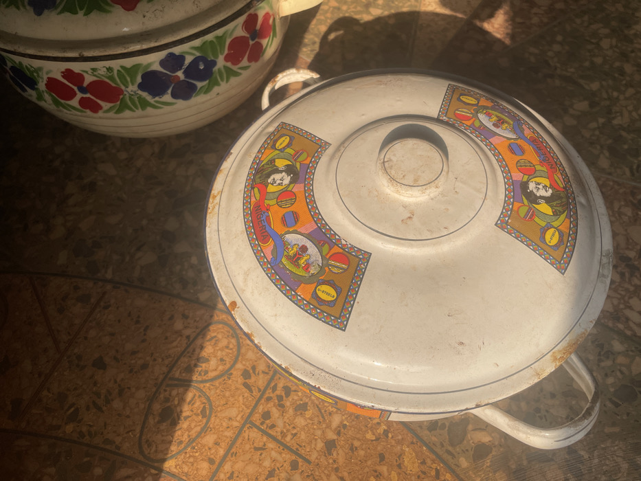 The scene depicts two enamel pots resting on a speckled, light-brown tiled floor, illuminated by direct sunlight which casts sharp shadows