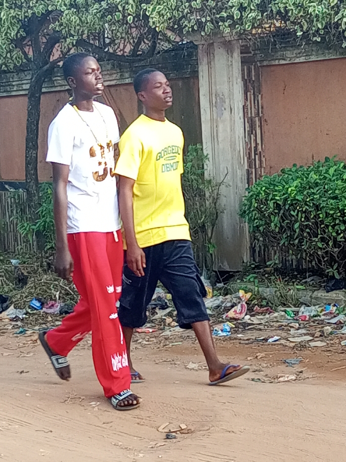Two young males are walking side-by-side on a dirt path in Obosi, Nigeria, under daylight conditions. The individual on the left, an adolescent male, wears a white short-sleeved t-shirt with a large brown "33" graphic on the chest and a long, multi-strand, gold-colored beaded necklace. He wears red sweatpants featuring white graphic designs on the lower legs and black and white slide sandals. The individual on the right, also an adolescent male, wears a yellow short-sleeved t-shirt with the green text "GORGEOUS DEMON" printed on the front. He is dressed in dark blue, knee-length cargo shorts and blue and brown flip-flops. Both individuals are in profile, looking towards the right, with their heads angled slightly upwards. The ground immediately adjacent to the path on the right is covered with scattered litter, including plastic bags and wrappers. In the background, a light brown wall with a vertical concrete pillar is visible, partially obscured by green foliage, including a dense bush and the upper branches of a tree with varying shades of green leaves.