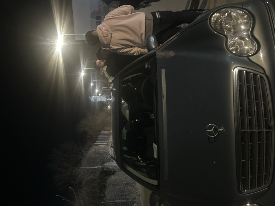 The image depicts an outdoor scene at night, described as being in Dobrich, Bulgaria, though the precise location within the city is not discernible from the visual information provided. In the foreground, a dark grey Mercedes-Benz C-Class (W203 generation, likely an estate/wagon model) is parked, oriented towards the camera. The Mercedes-Benz emblem is prominently visible on its hood. A large, clear plastic water bottle is balanced upright on the vehicle's roof, positioned above the windshield. To the right side of the Mercedes-Benz, a group of approximately three to four male individuals is gathered. One subject, viewed from behind, is wearing a light pink hooded sweatshirt and dark trousers with white text detail on the left thigh. He appears to be holding a white, elongated object in his right hand. Adjacent to him, another male subject wearing a dark hooded sweatshirt is partially visible. Further indistinct figures are present behind and to the right of these individuals. The environment is illuminated by several bright streetlights, one of which produces a distinct starburst lens flare directly above the group of people. The left background features a fence, a low wall, and dense, bare deciduous trees or bushes. In the far background on the right, a light-colored building is partially visible. The individuals appear to be casually standing and gathered near the parked vehicle; no specific actions or interactions are clearly discernible.
