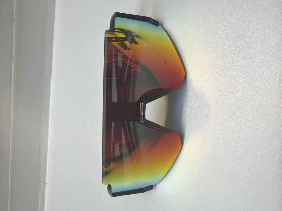 - "A pair of wraparound sports sunglasses with a dark, possibly black, partial frame and a single, iridescent, mirrored lens is centered in the foreground" by FM-8UYWC3, licensed under CC BY 4.0