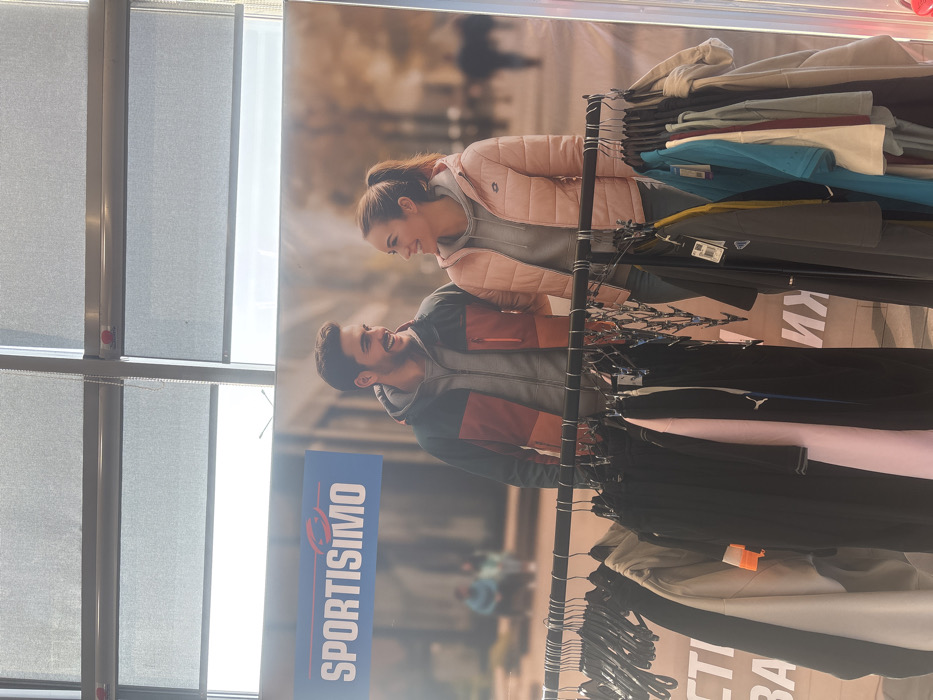The image depicts an interior view of a Sportisimo retail store in Sofia, Bulgaria