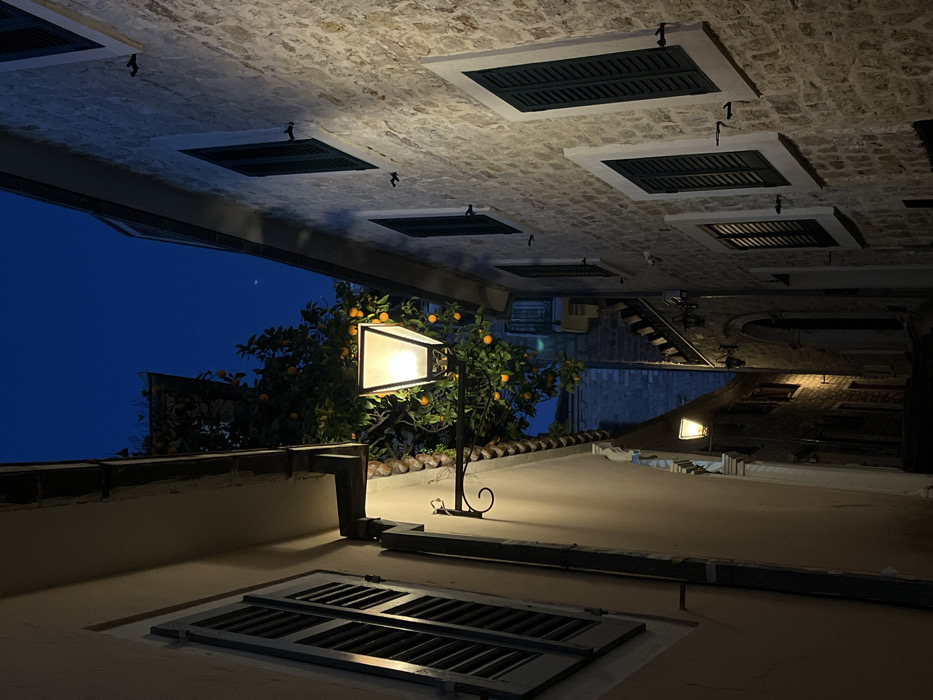 A low-angle shot captures a building's exterior at dusk. A streetlight illuminates an orange tree laden with fruit. Above, the building's ceiling is textured with square recesses, some containing dark shutters. The dark blue sky contrasts with the artificial light. Architectural details include a metal railing and a window with closed shutters on the building's surface. The perspective creates an illusion of looking upward at a ceiling.