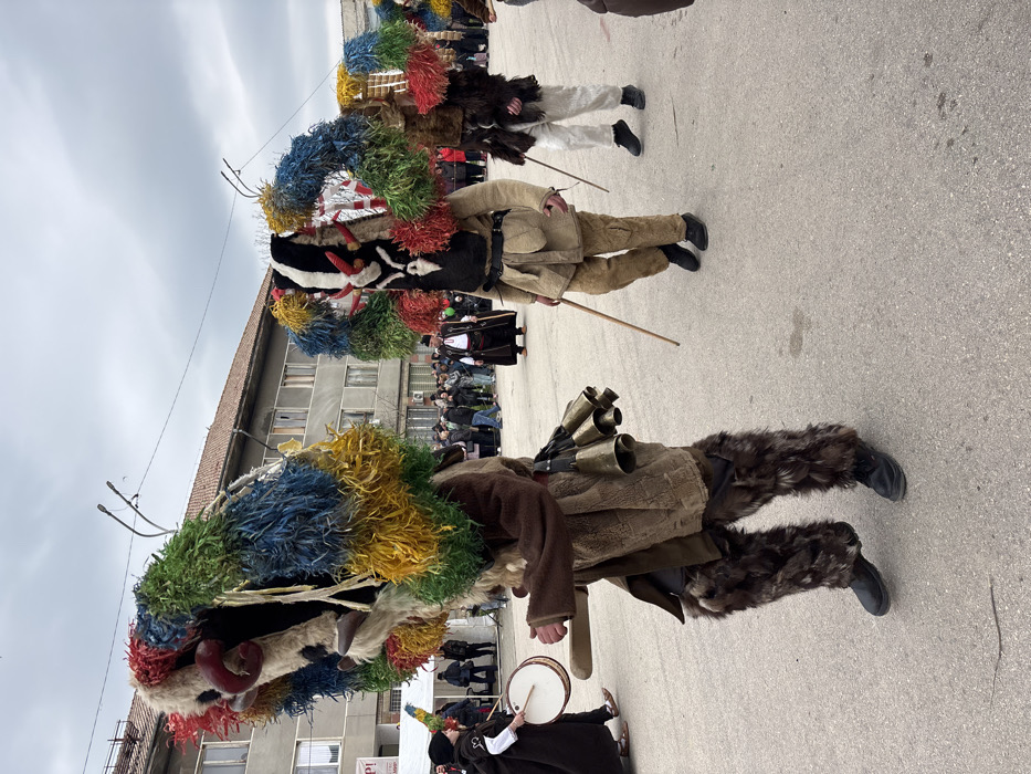 An outdoor cultural event is depicted on a paved grey surface in Aidemir, Bulgaria, under an overcast sky