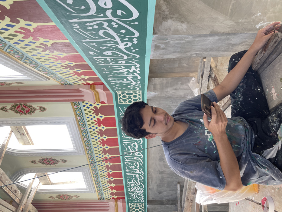 The image captures a young male seated within a mosque undergoing construction or renovation in Mns Asan, Indonesia. The male, with dark hair and a light complexion, wears a dark, paint-splattered t-shirt and pants. He is looking downwards, holding a dark-colored smartphone with both hands. He sits on a surface composed of wooden planks, with construction debris including plastic bags and a roll of tape visible nearby. The background features elaborately decorated interior walls. A prominent teal-green band displays white Arabic calligraphy, which appears to be a religious inscription. Above this band, the wall features intricate patterns, including red arched motifs and a yellow and blue geometric lattice. Further up, light-colored walls with pink-striped columns frame tall, arched windows that allow bright light to enter. Exposed wooden structural beams are visible above the windows, indicating ongoing architectural work.
