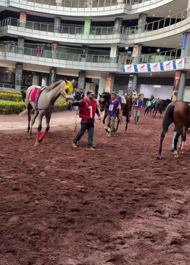 several horses being led around a reddish-brown dirt track. The horses are being handled by people who appear to be trainers or handlers. One horse is gray with red leg wraps and a yellow mask, being led by a person wearing a red jacket with the number 1 on it. Another horse is brown, led by someone wearing a purple shirt with the number 10. The setting appears to be an indoor racetrack or training facility, as there are multi-level structures surrounding the track with signage visible, including "Modelo" and "TCL". There are people walking around, and the overall atmosphere seems calm and preparatory.