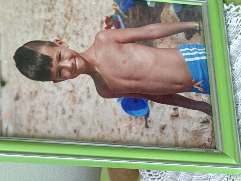 The image displays a physical photograph encased in a vibrant lime green rectangular frame, featuring a silver-colored inner border. The frame rests on a white, intricately crocheted doily or tablecloth. A small, brown, block-like object is partially visible to the left of the frame. The photograph within the frame depicts a young male child, estimated to be between six and eight years old, standing on a sandy beach. The boy faces forward, directly towards the viewer, and exhibits a slight, closed-mouth smile. He has dark, short hair, styled with a distinct shaved line creating a part on the viewer's left side of his head, with the top hair swept to the right. He is shirtless, displaying a lean physique and light tan skin. He wears blue swim shorts adorned with two horizontal white stripes on the outer right thigh, secured with an orange drawstring at the waist. A thin, light-colored band is visible on his left wrist. The background of the photograph consists of coarse, light-brown sand. To the boy's left, a partially visible blue and white inflatable object lies on the sand. To his right, several colorful plastic beach toys, including red, yellow, and blue elements, are scattered. The lighting suggests bright daylight, casting a slight shadow on the boy's left side. The specific geographical location of the beach depicted in the photograph, including any connection to Lovech, Bulgaria, cannot be determined from the visual information provided in this image.