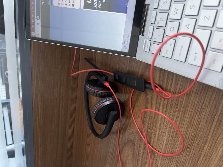 A black headset with a red cord is lying on a wooden desk. The headset is plugged into a laptop with a white keyboard. The laptop screen is displaying a weather forecast. The laptop is open and the keyboard is visible. There is a small black device connected to the headset. The desk is located in Nairobi, Kenya at latitude -1.262 and longitude 36.809. The scene is one of a person working on a computer, presumably at home or in an office. The headset suggests they are on a call or conference. The cord and the small black device imply that they are connected to their computer. There is nothing else in the scene, except for the wood desk and a window in the background.