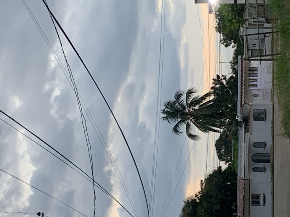 The image depicts a cloudy sky with a palm tree in the middle ground. Electrical wires cross the view, adding a layer of visual complexity. A white building with several windows stands to the right of the palm tree, partially obscured by foliage. The sky shows a hint of sunset on the horizon.
