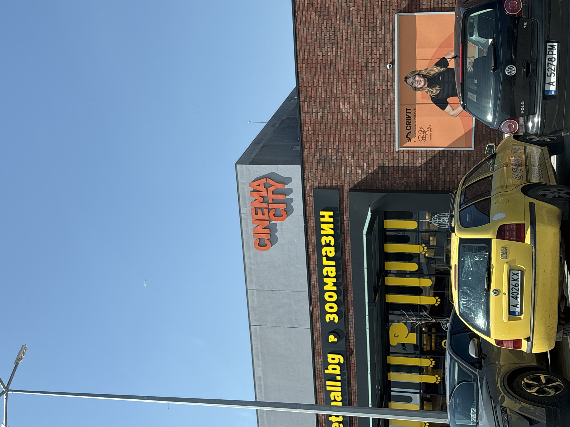 The image depicts an outdoor daytime scene in a commercial area within Burgas, Bulgaria, characterized by a bright, clear blue sky. A tall, grey metallic lamppost with a multi-bulb fixture is positioned vertically on the left side of the frame. In the distant sky, a small white object, possibly an aircraft or bird, is visible. The background features a multi-tiered building structure. The uppermost visible section is a grey-clad facade with a prominent orange sign displaying "CINEMA CITY." Below this, a section with reddish-brown brickwork extends across the width of the frame. On this brick facade, a long, black sign with yellow text reads "et hall.bg" and "300магазин" (300 stores in Bulgarian). Further right on the brick facade, a large rectangular billboard features a smiling woman (identified as Stefanie Graf, associated with "CRIVIT FIND YOUR MOVE") wearing a black shirt and vest, with hands on hips, against an orange and white background. A small CCTV camera is mounted above the billboard. At ground level, partially obscuring the building's lower section, is a paved area with parked vehicles. From left to right: 1. The front section of a dark grey SUV is visible. 2. A bright yellow Skoda Octavia station wagon is parked, facing away from the viewer. It bears Bulgarian license plate "BG A 4026 KX." The rear window is covered with a clear plastic material, secured by tape. A white decorative birdcage is affixed to the roof rack. Text on the side of the vehicle is partially visible, including "ЕЛЕГАНС 12" (Elegance 12) and phone numbers. 3. A black Volkswagen Polo hatchback is parked, also facing away from the viewer, with Bulgarian license plate "BG A 5278 PM." Behind the parked vehicles, the lower level of the building features dark glass storefronts with distinctive yellow and black striped awnings or decorations. Yellow graphic elements resembling elongated drips or paw prints, along with a cartoon face resembling a stylized letter 'P', are visible on the glass. Faintly visible through the glass behind these graphics is the Bulgarian word "Бургас".