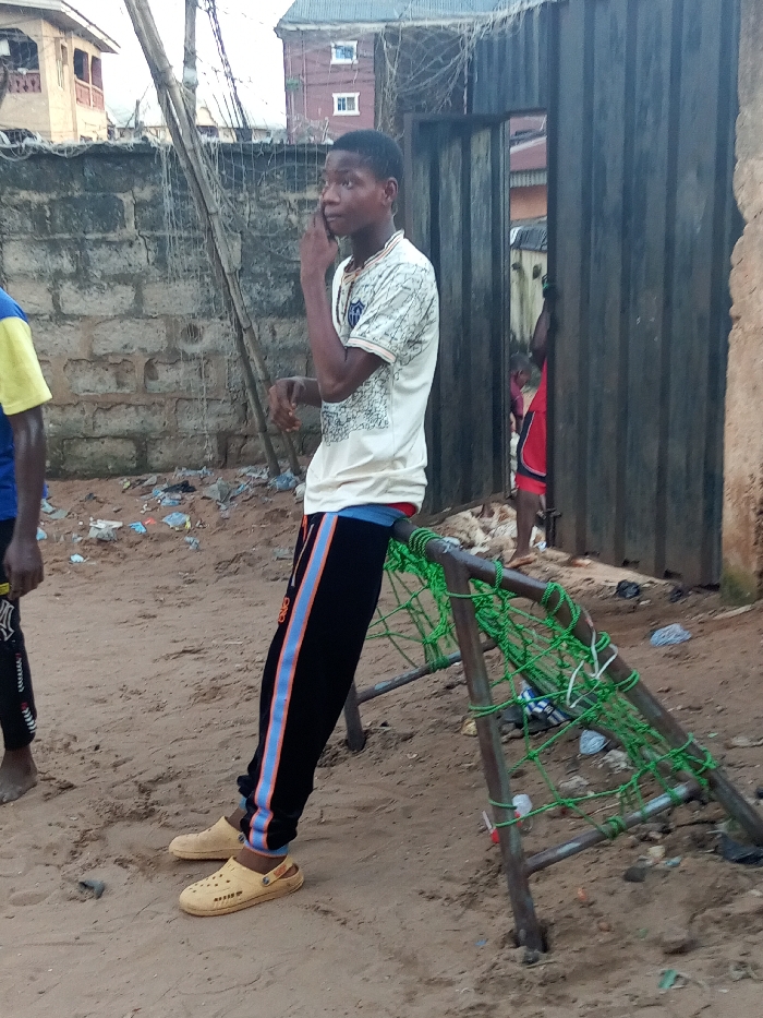 The image captures an outdoor scene in Awada, Nigeria, featuring a young male subject. He is positioned slightly right of center, wearing a cream-colored, short-sleeved shirt with a dark geometric pattern, black track pants with vertical blue and orange stripes on the outer seams, and light brown clogs. His right hand is raised to his jawline as he leans against a makeshift, triangular goalpost constructed from dark metal poles and green rope netting. One section of the netting includes white string. The ground is composed of reddish-brown earth, uneven and scattered with various pieces of litter and debris, including plastic items and paper. Behind the primary subject, a concrete block wall, discolored and weathered, extends horizontally across the middle ground. Beyond this wall, multi-story residential buildings with visible windows are present in the background. To the far left of the frame, the torso and left leg of a second individual are visible, clad in a blue and yellow shirt and dark pants, with bare feet. To the right, a dark, corrugated metal gate stands ajar, partially obscuring a third individual whose lower torso and legs, dressed in red shorts, are visible within the opening. A tall, slender pole structure, possibly utility-related, rises vertically behind the main subject, appearing to be made of wood or metal.