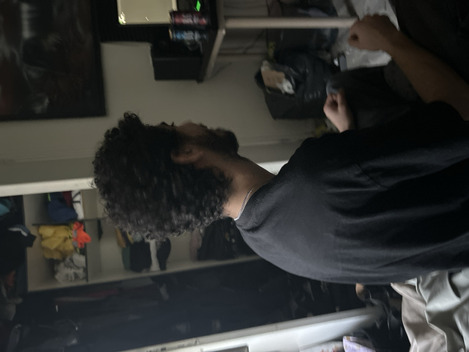 A man with curly hair and a beard stands in a room. He is wearing a black shirt and has a silver chain around his neck. Behind him is a shelf or closet with various items stored on it. Above the shelf is a TV or monitor mounted on the wall, along with what appears to be a video game console. Another person's arm is visible on the right side of the frame. The room has low lighting.