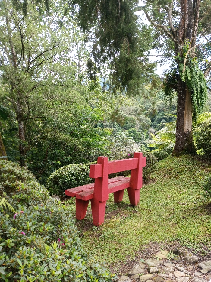 A red wooden bench sits on a grassy patch in a lush garden. The bench has a simple, blocky design. Behind it, various green bushes and trees fill the landscape, creating a dense and vibrant backdrop. A large tree with ferns growing on its trunk stands to the right of the bench. A stone pathway can be seen near the lower right corner, adding to the garden's charm.