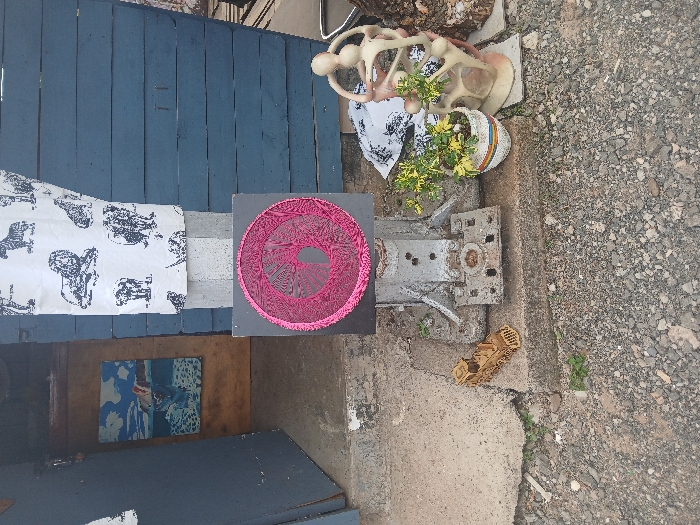 Various objects are arranged on a surface: a blue wooden structure, a piece of white fabric with dark designs, a square black object with a pink circular pattern, a small painting, a silver metal piece, a small carved wooden object, and two potted plants next to a human-shaped decorative object. They rest on concrete or gravel.