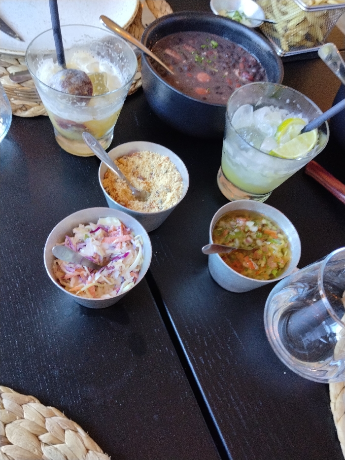 This image depicts a dining table laden with food and beverages, indicative of a meal in a restaurant or home setting in Viana do Castelo, Portugal. Centered prominently on a dark wooden table is a large, black, round pot containing a dark stew, consistent with feijoada, featuring black beans and circular slices of sausage, with a silver serving spoon partially submerged. To the immediate right of the pot, a clear glass holds a light green beverage filled with ice cubes, garnished with two lime wedges, and a dark straw. To the left of the pot, another clear glass contains a yellowish beverage with ice and a large, dark, spherical garnish impaled on a dark straw, along with a lime wedge partially visible. Three small, silver-colored metal bowls are arranged in the foreground. The top bowl contains a finely granulated, light brown substance, consistent with farofa. The middle bowl holds a salad composed of shredded white and red cabbage mixed with a creamy white dressing. The bottom bowl contains a diced vegetable mixture, primarily green and red, consistent with vinagrete. Each of these three bowls contains a small silver serving spoon. In the upper right background, a metal mesh basket filled with golden-brown fried potatoes is partially visible. A woven, light-colored placemat is situated under the leftmost drink glass. A clear, empty wine glass is visible in the lower right foreground. The table surface is dark, likely wood, exhibiting a subtle grain texture. No individuals are visible in the frame.