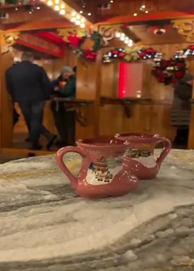 Here's a concise description of the video: The video shows a Christmas market scene. Two pink ceramic mugs decorated with snowy winter scenes sit on a table covered with artificial snow. Behind the mugs, several wooden stalls decorated with Christmas lights, wreaths, and ornaments are visible. People are standing in and around the stalls. The ground appears wet, and there are yellow and black striped barriers along the edge of the stalls. Overall, it's a typical Christmas market atmosphere.
