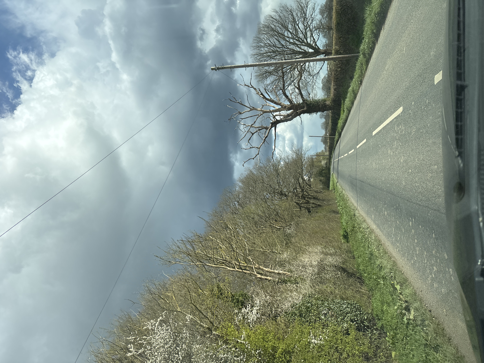 The image captures a rural road scene, viewed from inside a vehicle, with a portion of the dashboard visible at the bottom. The asphalt road, marked by a broken white center line, recedes into the distance. On the left, a dense line of trees and scrub borders the road, displaying a mix of green foliage, white blossoms indicative of spring, and bare branches. On the right, a low hedgerow runs parallel to the road, beyond which fields and distant trees are visible. Two prominent trees stand on the right side of the road: one large, gnarled tree with largely bare, skeletal branches, and a second, fuller, bare-branched tree further to its right. A wooden utility pole with attached lines stands adjacent to the gnarled tree. Overhead utility lines traverse the sky. The sky features a combination of bright white cumulus clouds and darker grey stratocumulus clouds, with patches of blue sky visible. No individuals or other vehicles are present in the immediate observable area. The environment is characteristic of a countryside setting within the Reigate and Banstead district, United Kingdom.