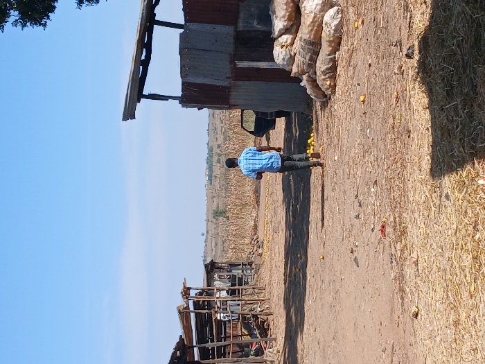 This image depicts an outdoor agricultural staging or storage area in Vom, Nigeria, under a clear blue sky. In the foreground, the ground is dry, light brown dirt mixed with straw and scattered debris. A lone male figure, viewed from behind, walks away from the camera toward the background. He wears a light blue checkered shirt and dark trousers. To the left, a rudimentary structure with a wooden frame and a flat roof is visible. To the right, a second makeshift structure stands, constructed with a wooden frame and weathered, partially rusted corrugated metal panels, topped by a slanted roof. Adjacent to this structure, a pile of several large, bulging sacks, likely containing produce such as yams or potatoes, rests on the ground. A dark-colored vehicle with an open door is partially visible behind this structure. Numerous yellow-orange spherical fruits, consistent with oranges or similar citrus, are scattered across the dusty ground, particularly around the walking individual and extending into the mid-ground. In the background, beyond the immediate activity area, lies an expansive field of dry, tall crops, likely maize or corn, stretching towards distant low hills or structures under the horizon. The scene is illuminated by bright daylight, suggesting a dry and sunny period.