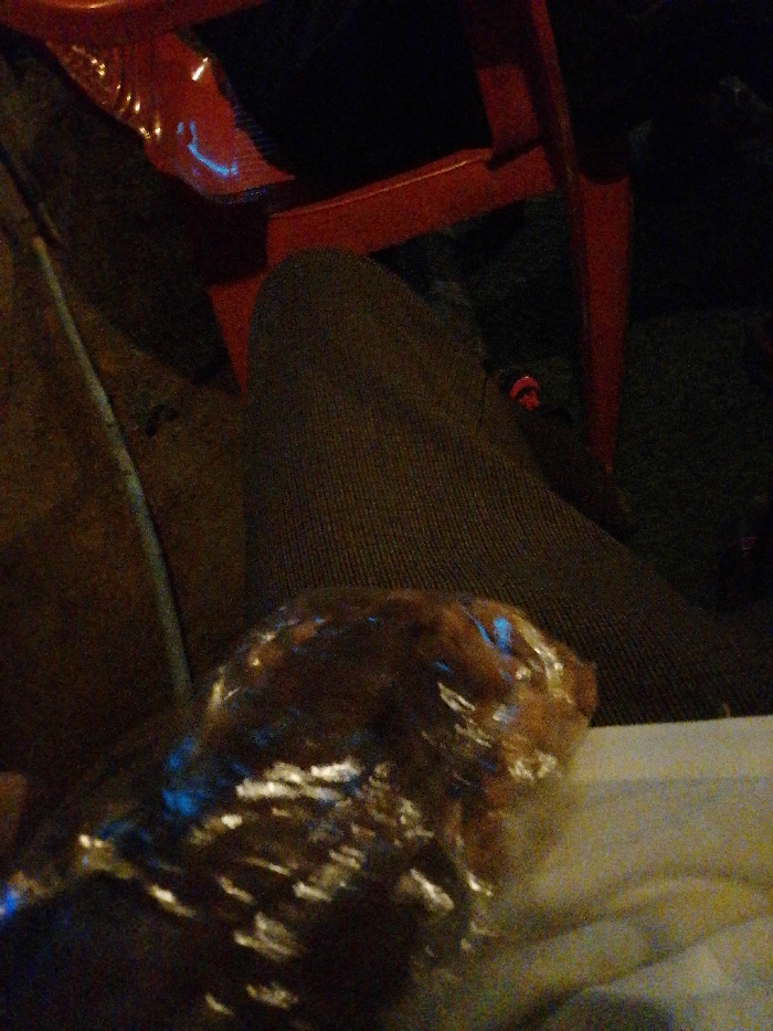 A wrapped pastry item rests on a white surface, possibly a napkin or plate, atop what appears to be someone's leg clad in denim jeans. The lighting is dim, creating dark shadows and reflections on the plastic wrapping. A red plastic chair is visible in the upper portion of the frame, suggesting an indoor or semi-outdoor setting. The focus is primarily on the food item, with the background elements blurred and out of focus.