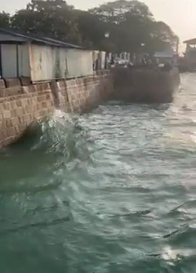 body of water with a brick wall on the left. The water is choppy, with small waves lapping against the wall. In the background, there is a building on stilts in the water and the sun shining brightly, obscuring detail. Trees are visible near the building on stilts. There are people along the wall to the left. There are no apparent interactions in this video. The environment is a body of water on a sunny day.